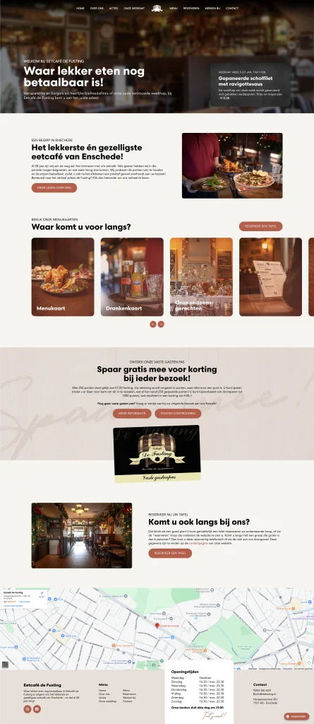 Voor de Fusting was de opdracht simpel; een mooie website creëren waar onze gasten alles kunnen vinden – en dat is zeker gelukt. De website is overzichtelijk en straalt uit waarom uit eten gaan bij de Fusting iets is wat ervaren moet hebben. Want zeg nou zelf, een heerlijke maaltijd die ook nog betaalbaar is; wie wil dat nou niet?